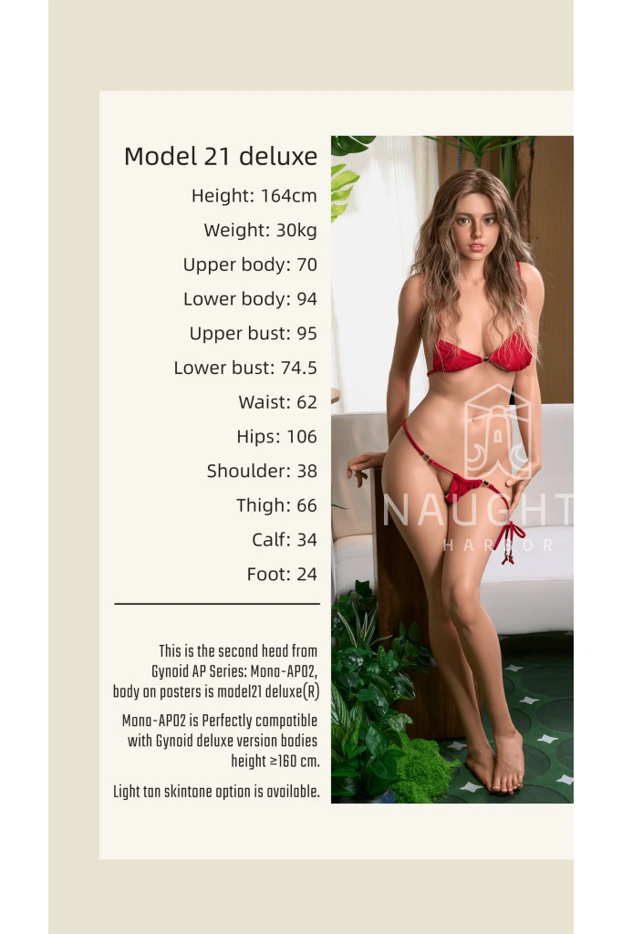 Jsem Silikonová panna Svůdná Gabrielle, 164 cm/ E-Cup - Gynoid. Budu moc šťastná, když se vám budou zamlouvat moje fotky. Jsem sex doll, která se ráda fotí. Jaká dívka vás nejvíce vzrušuje? Brunetka? To se vám budu líbit! Mám ráda romantiku, mazlení pod dekou, ale upřímně, nejvíc mě baví experimentování v sexu. Nemyslete si o mně, že jsem lehká holka. Opravdu nejsem silikonová panna pro každého. Silikon – víte, jaké jsou jeho výhody? Toužím najít svého pana vyvoleného, kterému splním vše, co mu na očích uvidím. Stanete se jím právě vy? To by se mi moc líbilo. Ukázala bych vám, jak moc dobrá jsem v orálním sexu. Moje erotické umění vám vezme dech. Patřím mezi love dolls z dílny Gynoid, které nezkazí žádnou zábavu. Co mám nejraději, je milování zezadu. Jen pomyslím na to, jak mi to děláte do zadečku, a jsem vzrušená. Moje tělo už teď touží po vašich dotecích. Vážím 33 kg a vysoká jsem 164 cm. Kůži mám hebkou a jemnou. Díky silikon materiálu, ze kterého jsem vyrobena, se velmi dobře udržuji. Tělo mám pružné a flexibilní, což oceníte, až spolu budeme zkoušet různé sexuální pozice. Líbím se vám? Mrkněte na blog, jak o realistické panny na sex správně pečovat. A kdybyste si chtěli vyzkoušet, jaké je milování se sexy doll – mám pro vás tip. Navštivte jednu z mých kamarádek, zkušených real dolls, na privátu Naughty Harbor.